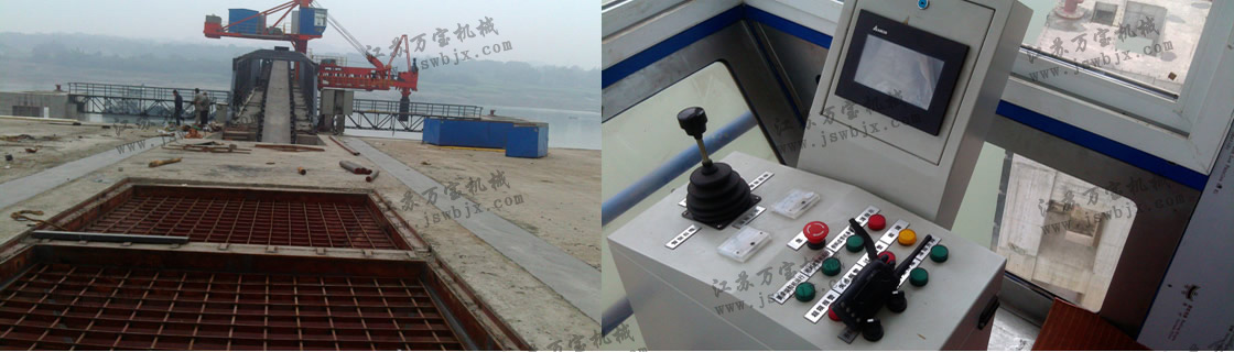 墩柱式裝船機,具有臂架俯仰及伸縮、供料皮帶機、可伸縮和旋轉溜筒、尾車、除塵、供電和控制電纜卷筒等機構和裝置。臂架工作俯仰、臂架伸縮、供料皮帶機、溜筒伸縮等各機構既可單獨運行,也可根據需要組合聯動。