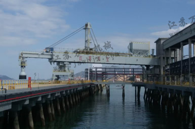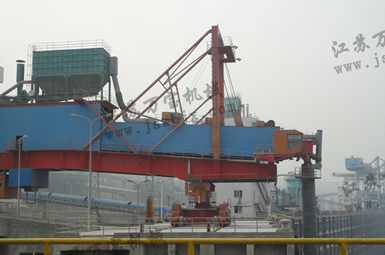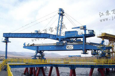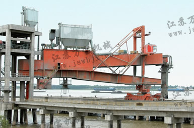 直線式擺動裝船機是一種整機不沿碼頭岸線移動的固定式裝船機。它與弧線式裝船機的主要區別是,裝船機的前端棧橋的軌道呈直線形,也就是裝船機的橋架沿直線軌道擺動。這種裝船機具有其獨特的優點:采用大跨距的回轉橋架,由于前端有支承軌道,所以避免了巨大的懸臂傾覆作用,有利于加大回轉半徑,在較小的伸縮變幅的情況下,完成長大艙口的覆蓋面積。這樣就可以采用單機頭,充分發揮皮帶機高效率的特點;水工建筑也只受豎向載荷,使水工建筑的投資減少。但這種裝船機的臂架支點的結構很復雜,不僅要能旋轉,而且要能伸縮,并要求這些動作同步進行,所以直線式裝船機的技術要求高。