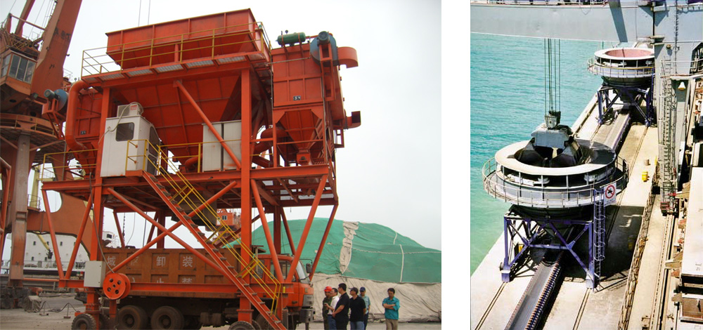 無軌道移動式裝船機(jī),行走裝置有輪胎、履帶兩個(gè)系列,物料進(jìn)入裝船機(jī)的方式有:1)自卸卡車直接倒料的進(jìn)料裝置,每套進(jìn)料裝置的接受能力為625m3/h,弧形懸臂式可配置兩套進(jìn)料裝置,裝船能力達(dá)到1200m3/h,塔式可配置四套進(jìn)料裝置,裝船能力達(dá)到2400m3/h;2)裝載機(jī)進(jìn)料的料倉;3)皮帶機(jī)進(jìn)料的料斗。有軌道移動式裝船機(jī),如圓弧軌道式、直線軌道式、前直線軌道擺動和后直線軌道擺動。對于水文落差較大的碼頭,采用在浮式躉船安裝1-2臺圓弧軌道式,直線軌道式需要配置相應(yīng)的尾車輸送機(jī),擺動式裝船機(jī)適用于環(huán)保要求較高的碼頭,采用大跨距的回轉(zhuǎn)橋架,完成長大艙口的覆蓋面積。對于船型很小或移船方便的碼頭,為減少投資,可選用墩座式裝船機(jī)。袋包裝船有螺旋滑槽式和托輥式。